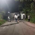 Um caminhão baú se envolveu em um acidente, vindo a tombar, na noite deste domingo (8), na Rua Afonso Rodrigues Bittencourt, na subida para o bairro Roçadinho, em São José do Vale do Rio Preto. Com o acidente, a passagem de veículos ficou completamente fechada na localidade. Segundo informações de populares, não houve registro de feridos. As circunstâncias do acidente ainda não foram esclarecidas.