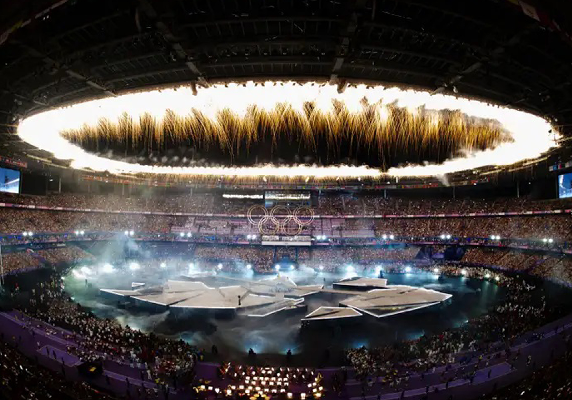 A parte de espetáculo visual e musical da cerimônia contou com uma projeção da estátua da deusa Nike, uma das obras de arte mais famosas expostas no Museu do Louvre. O símbolo olímpico com os cinco anéis subiu o Stade de France.