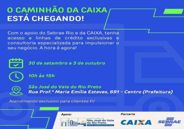 O Caminhão Caixa vai reforçar o atendimento a micro e pequenos empreendedores em São José do Vale do Rio Preto, na Serra Fluminense. Até sexta-feira, 3 de outubro, a unidade móvel ficará estacionada na rua Professora Maria Emília Esteves 691, no Centro da cidade (Pátio da Prefeitura Municipal), para atender exclusivamente esse público. O horário de funcionamento é das 10h às 15h.