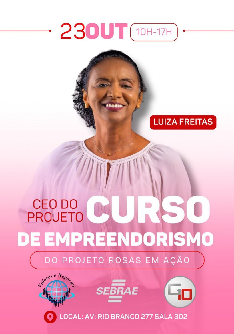 No próximo 23 de outubro, o Projeto Rosas em Ação promove, na Escola do Sebrae (Cinelândia), das 10h às 17h, o Curso de Empreendedorismo Feminino, sob o comando de Luiza Freitas, idealizadora do projeto que há nove anos transforma vidas através da capacitação e do incentivo ao empreendedorismo.