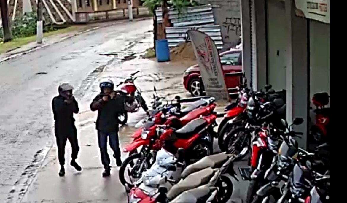 As câmeras de segurança flagraram a chegada de dois dos suspeitos envolvidos no crime e o momento em que os criminosos abordaram o proprietário da loja “Estação das Motos”.