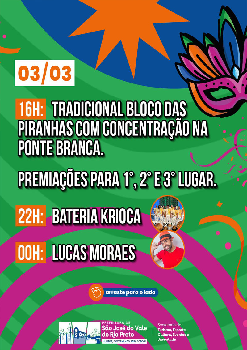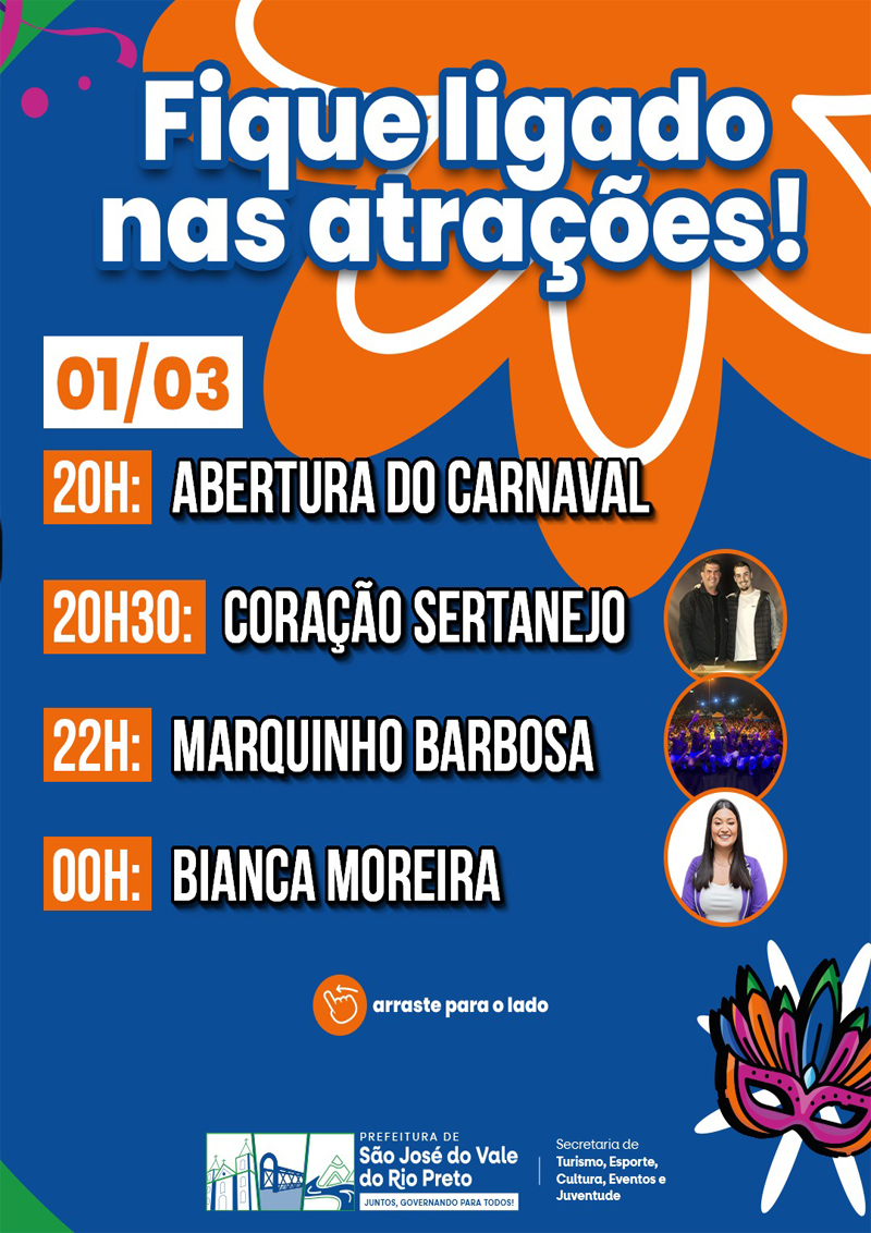 Entre os dias 1º e 4 de março, acontece o Carnaval 2025. E, em São José do Vale do Rio Preto, a municipalidade está programando uma festa especial para os festejos carnavalescos. Com o tema: “A alegria está de volta”, a programação promete ser uma das melhores da região.